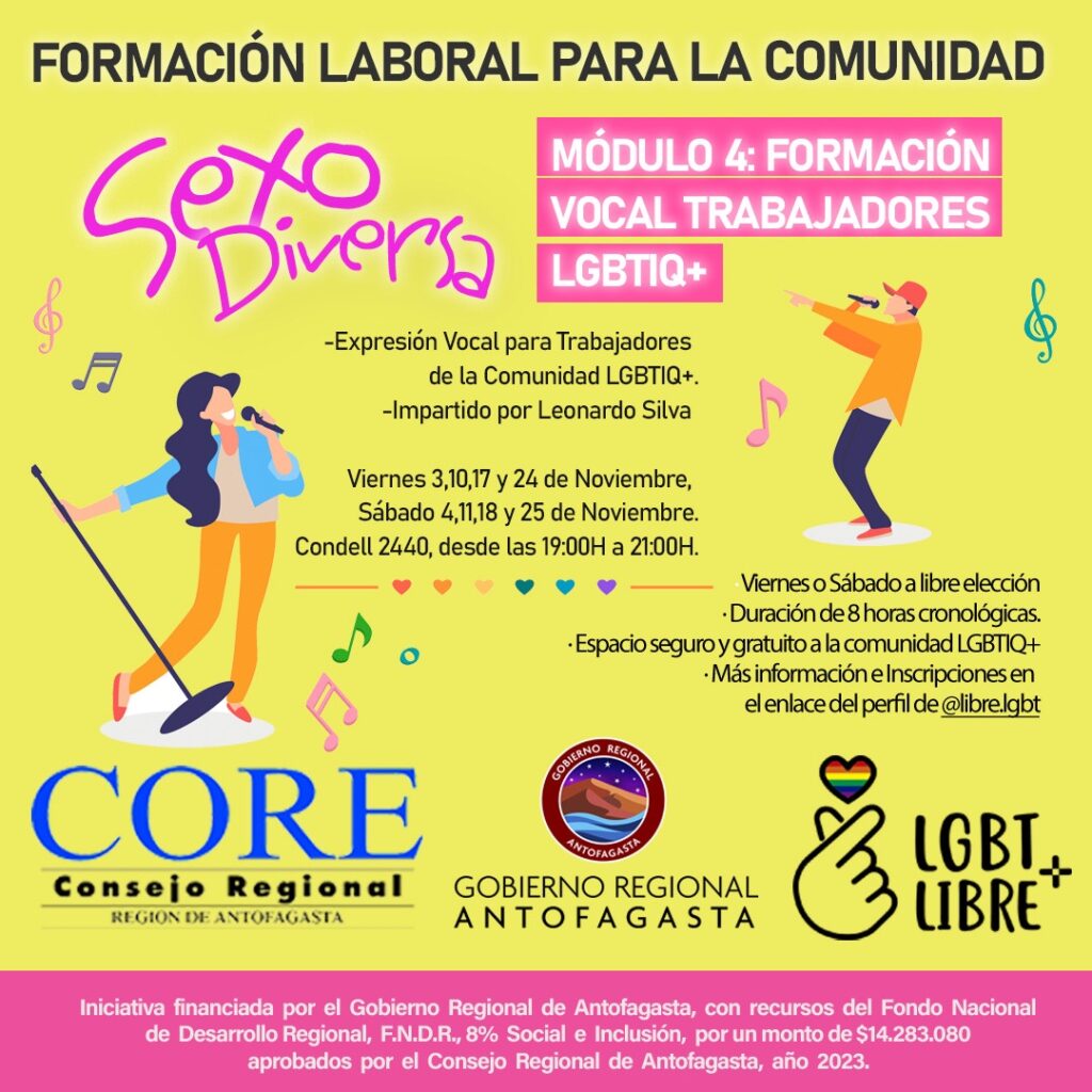 El módulo denominado “Formación Vocal para Trabajadores LGBTIQ+” tiene abierta su convocatoria para las sesiones que comienzan este 3 y 4 de noviembre. Es así, que en el instagram de la Corporación LGBT + Libre (@libre.lgbt) está disponible el formulario de inscripción para quienes quieran ser parte de este taller gratuito a cargo de Leo Mava (@leo_mava_music).